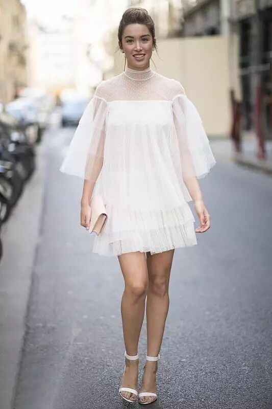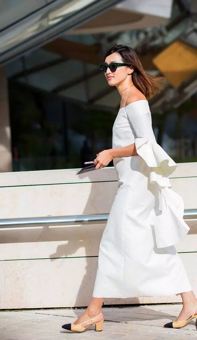 时尚博主Nicole Warne用Chanel的方跟鞋来衬托小白裙温婉气质,夸张的荷叶袖灵动唯美。