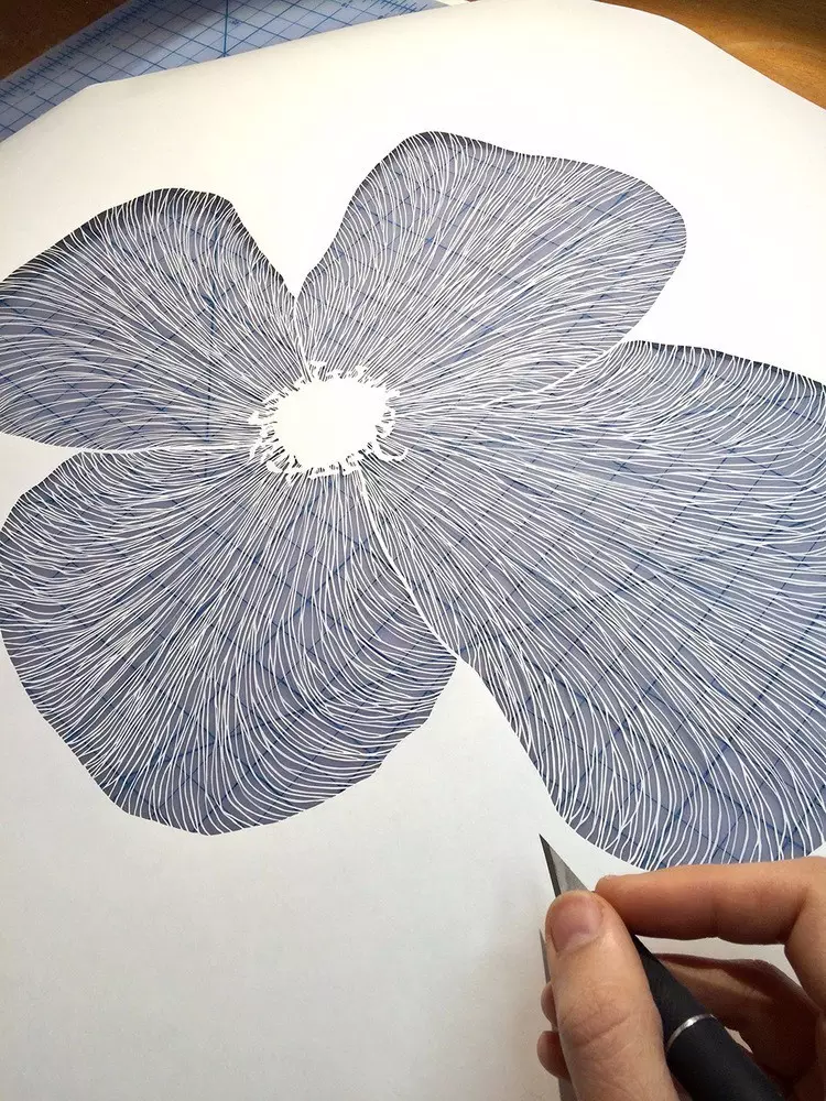 第一眼看去,会以为这是绫罗绸缎上的花纹,仔细一看简直叫绝,这竟然是普通的白纸!白纸上的美丽图案并非机器雕刻的,而是 Maude 用刻刀一刀一刀雕刻而出,类似于传统的剪纸艺术却比剪纸更加精细唯美!这些杰作五花八门,譬如各式各样的花卉: